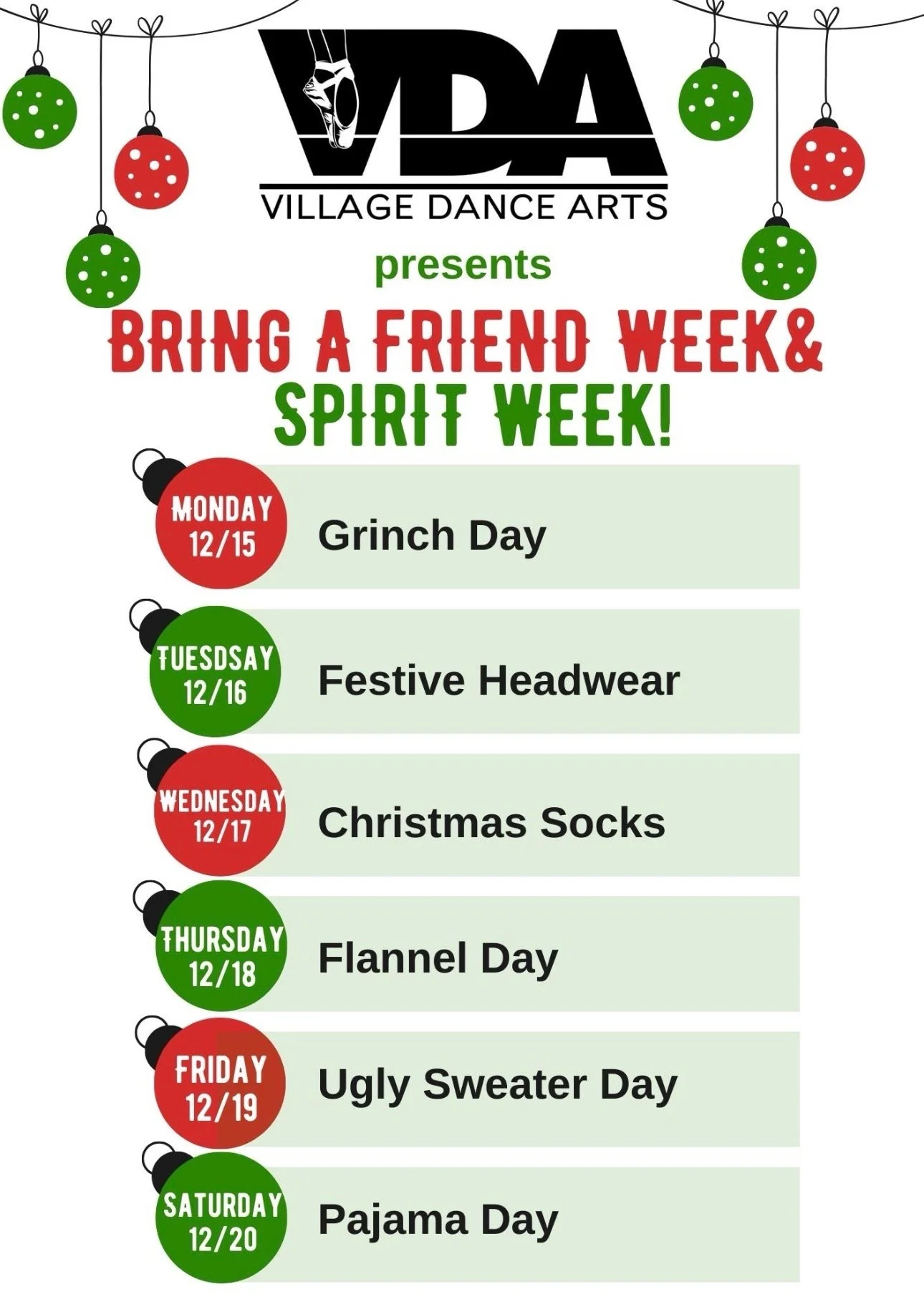 Monday, December 15th through Saturday, December 20th is Bring a Friend Week AND Spirit Week all in one!